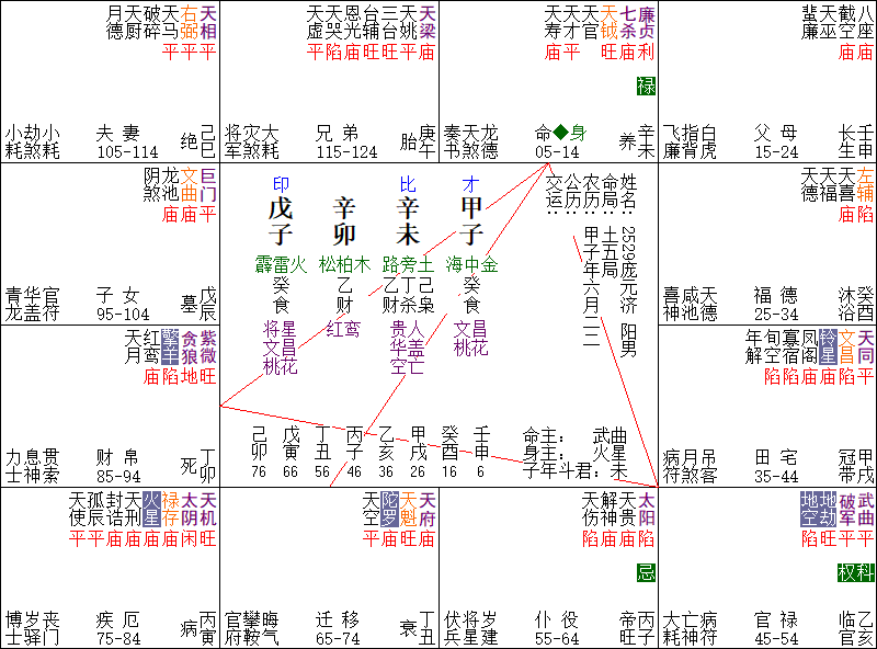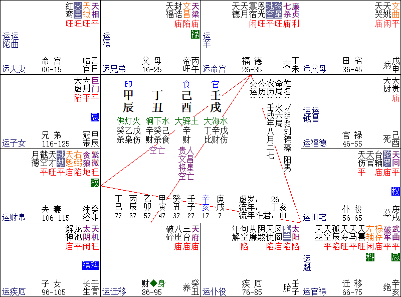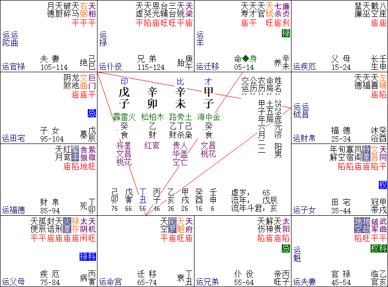 庞公之造,有点美的是:天巫逢壬,壬这个天干是可以让天梁星化禄的,而天梁呢,又是斗数里非常著名的“荫星”,父荫,祖荫这些。所以,天巫遇壬,这是可以取到交集的,至少可以取一个“遗产继承”像。