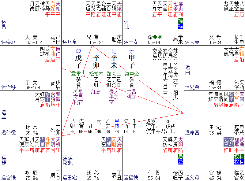 35-44岁大限,公行至娃娃星落入宫位,大限禄入大限娃娃宫,是限独子诞生。看,斗数是不是垂象垂得非常明显?